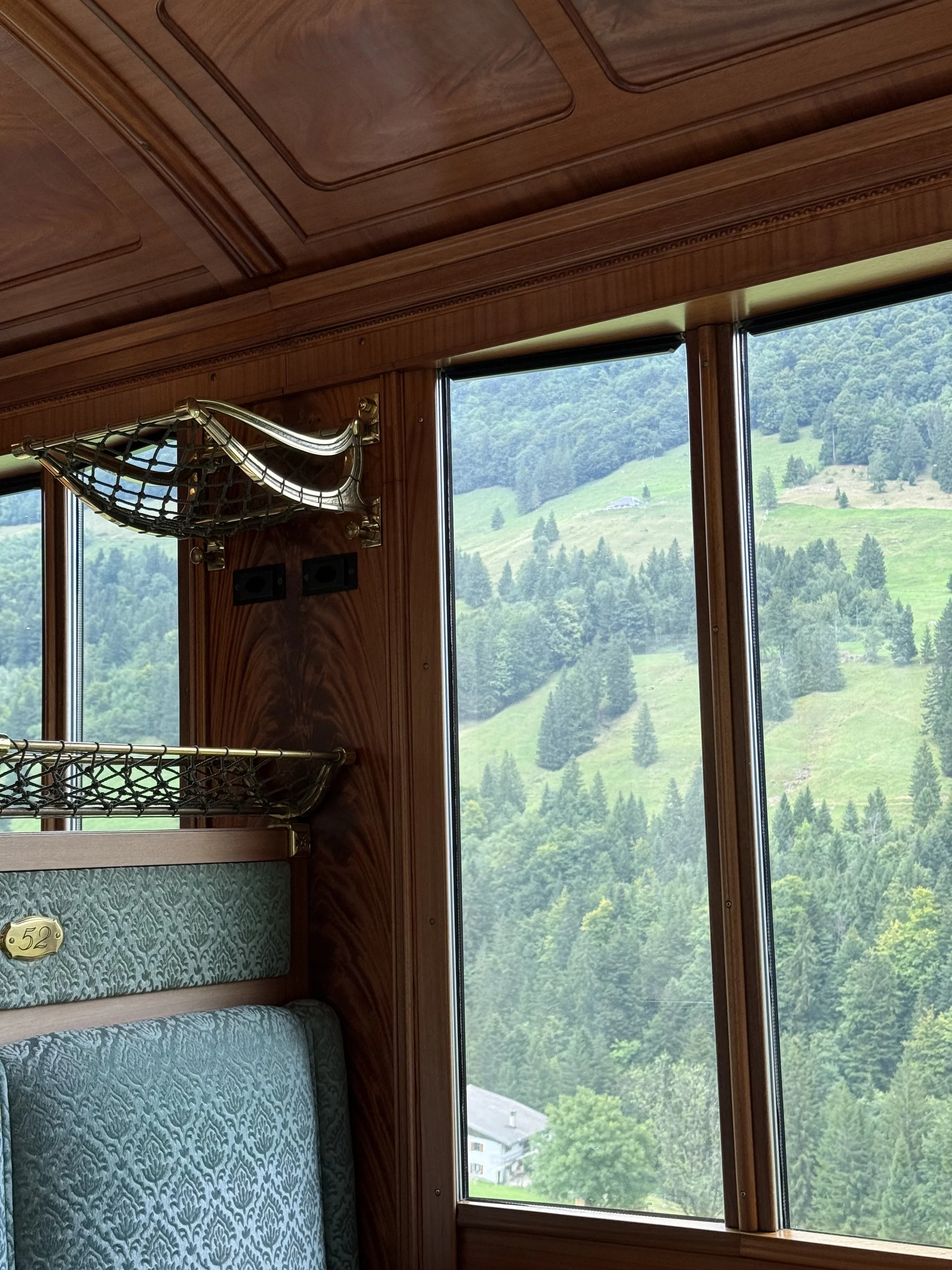 Riding the GoldenPass Belle Époque Train - This vintage train, with both 2nd and 1st class options, is one of the loveliest ways to travel through the valley. Having travelled 2nd class before, charming with its wooden bench seating, small tables and little lamps, we decided this time to upgrade to 1st class for a more opulent experience. Think cosy armchair-style seating for 48 Swiss francs, compared to 28 for 2nd class. We booked via SBB.